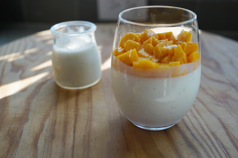 An easy and healthy dessert, sweetened and topped with fresh and luscious mangoes!