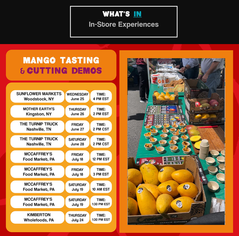 This trend reflects how shoppers are increasingly spending on food that delivers emotional and visual impact. Mangoes naturally bring color, aroma, and tactile appeal, making them ideal visual anchors in the produce department. Their price points, especially in summer, are often relatively low compared to other fruits, and their displays tend to be larger. When merchandising follows expert guidance — like what Brian Dey consistently recommends — the result is bold, confident displays that actually move product. Retail activation shows up through color-driven mango displays built with a plethora of variety and ripeness, smart complementary produce pairings, and encouraging countertop presence at home. Mangoes help set warmth and mood in the department. Displays full of useful mango-education that inspire encourage shoppers to fill their carts with mangoes and produce in general. Whether those dreams are realized are not the point with mangoes because you can eat it as is for the same beautiful experience. Crespo Organic’s Summer Mango Mania campaign remains one of the strongest demonstrations of the mango experience — an captures the epitome of what I coined #MangoJoy.