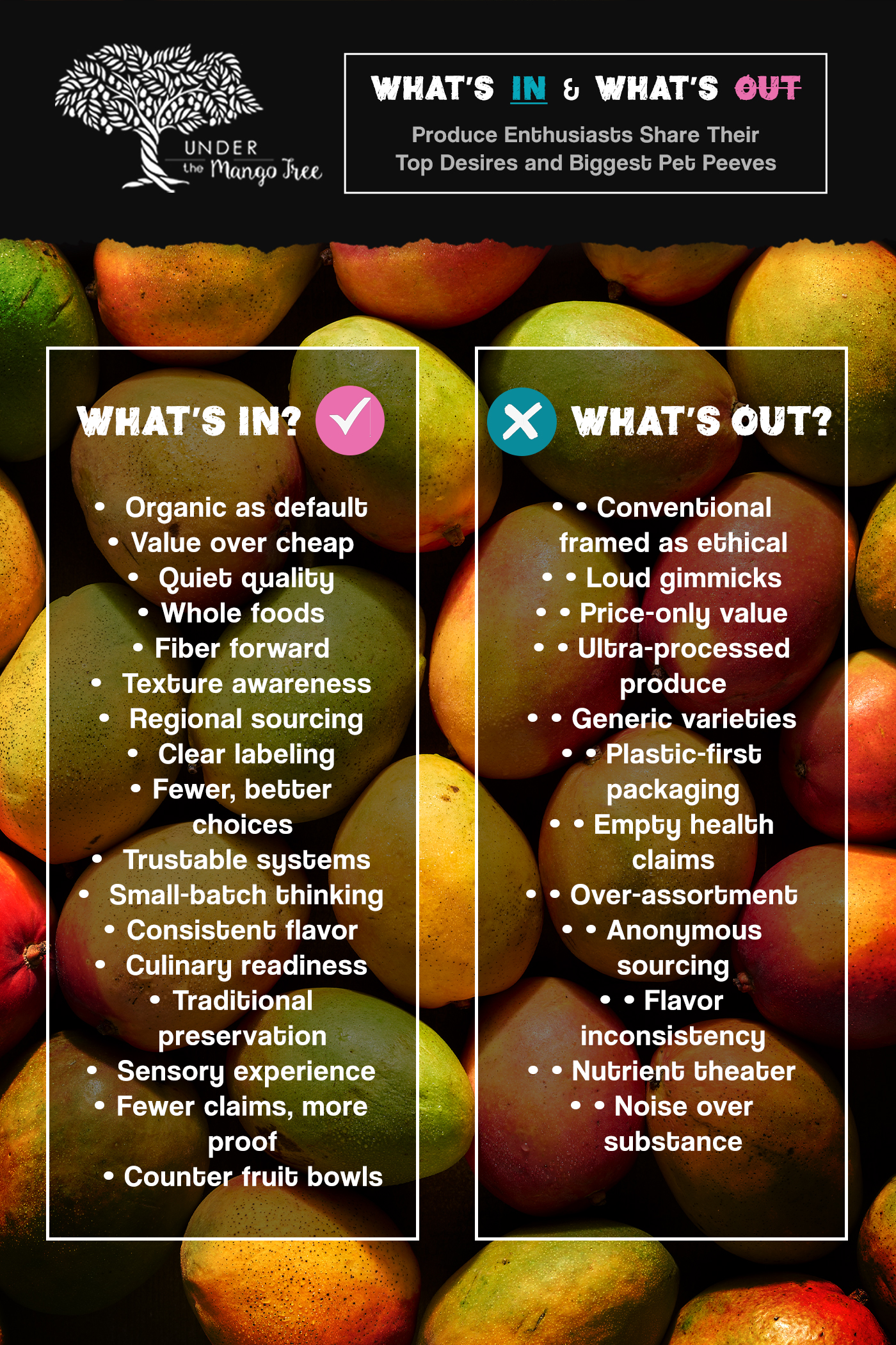 I love breaking down trends and reminding people how naturally most of them align with fresh organic mangoes. Where I see the most value—and where my expertise lives—is in translating these widely agreed-upon shifts into mango-specific insight: how they apply to mango merchandising, how they authentically attract consumers and farming communities, and how mangoes can connect multiple departments and moments across the store. Organic mangoes fit this moment again and again—across quality, trust, value, tactility, and pleasure.Across the grocery industry — from Whole Foods’ annual trend forecast to Natural Grocers’ key trends for living well to broader retail like FoodNavigator’s 2026 food trend predictions to my own musings on the antidote to the most negative food trend of SLOP & greenwashing — there is, as usual, a clear consensus around a core set of themes shaping how food will be grown, sold, and experienced in 2026, and what follows is my interpretation of those shared trends through the lens of mangoes: how they show up best on the shelf, in the supply chain, and the eating experience.