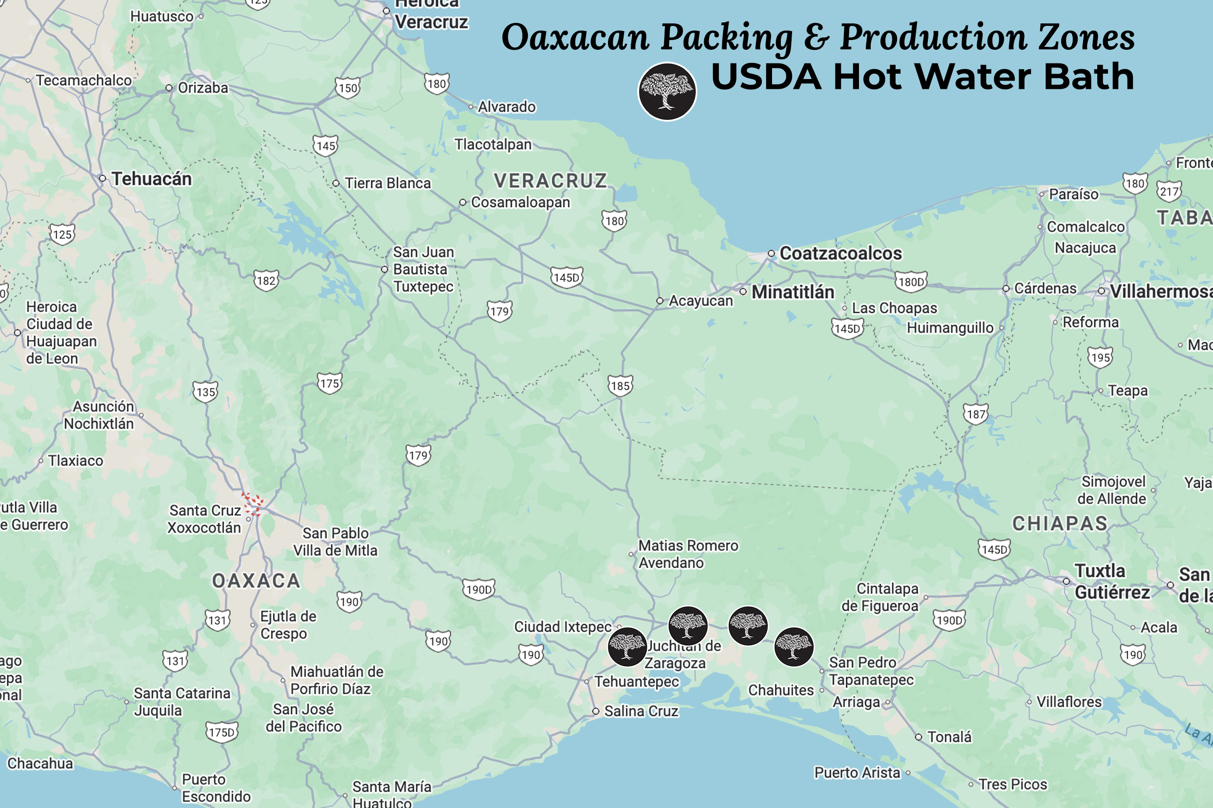 While mangoes are grown all over Oaxaca, the USDA export packhouses are anchored in the eastern Isthmus of Tehuantepec, with more than a dozen USDA hot water bath packhouses located in and around Chahuites and San Pedro Tapanatepec. These plants are fed almost entirely by nearby production from around the Isthmus, primarily from Chahuites, San Pedro Tapanatepec, Reforma de Pineda, Ixhuatán, and Santo Domingo Zanatepec.