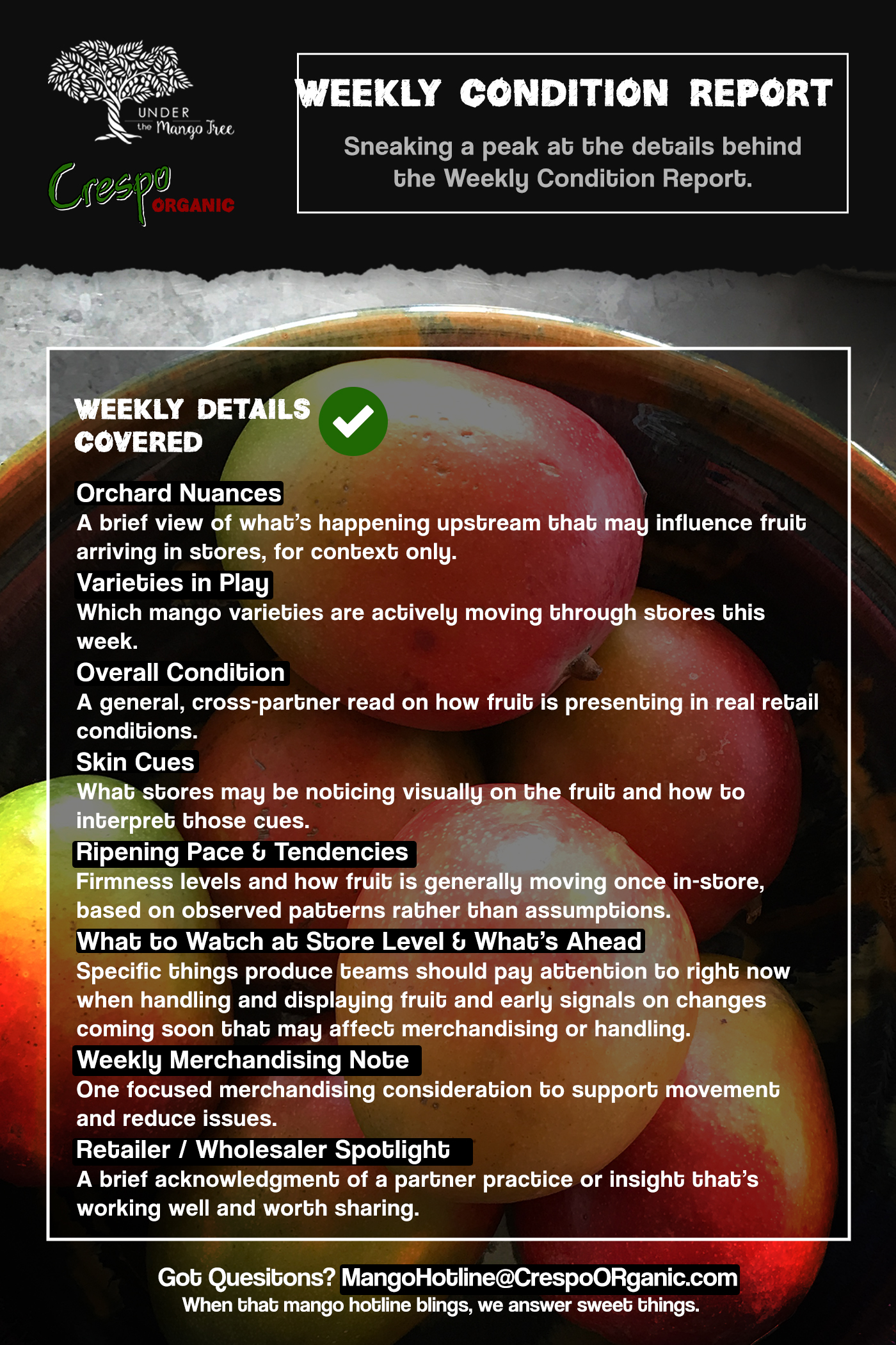 With the launch of this seasonal weekly report, Crespo Organic is also introducing a dedicated mango hotline for questions, comments, or issues as they arise. Like any good hotline, it serves as a direct channel for sharing information and solving problems quickly, helping keep communication clear and responsive across the Crespo program.