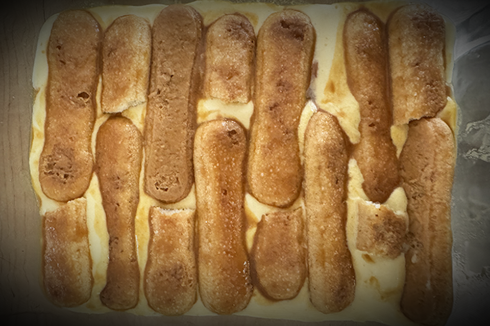 Working two at a time, dip each ladyfinger in the espresso and flip — you want them to absorb some liquid but not too much. Place each ladyfinger rounded side up in the bottom of the dish until you have an even layer covering the bottom, breaking a few as needed depending on the size and shape of your dish.